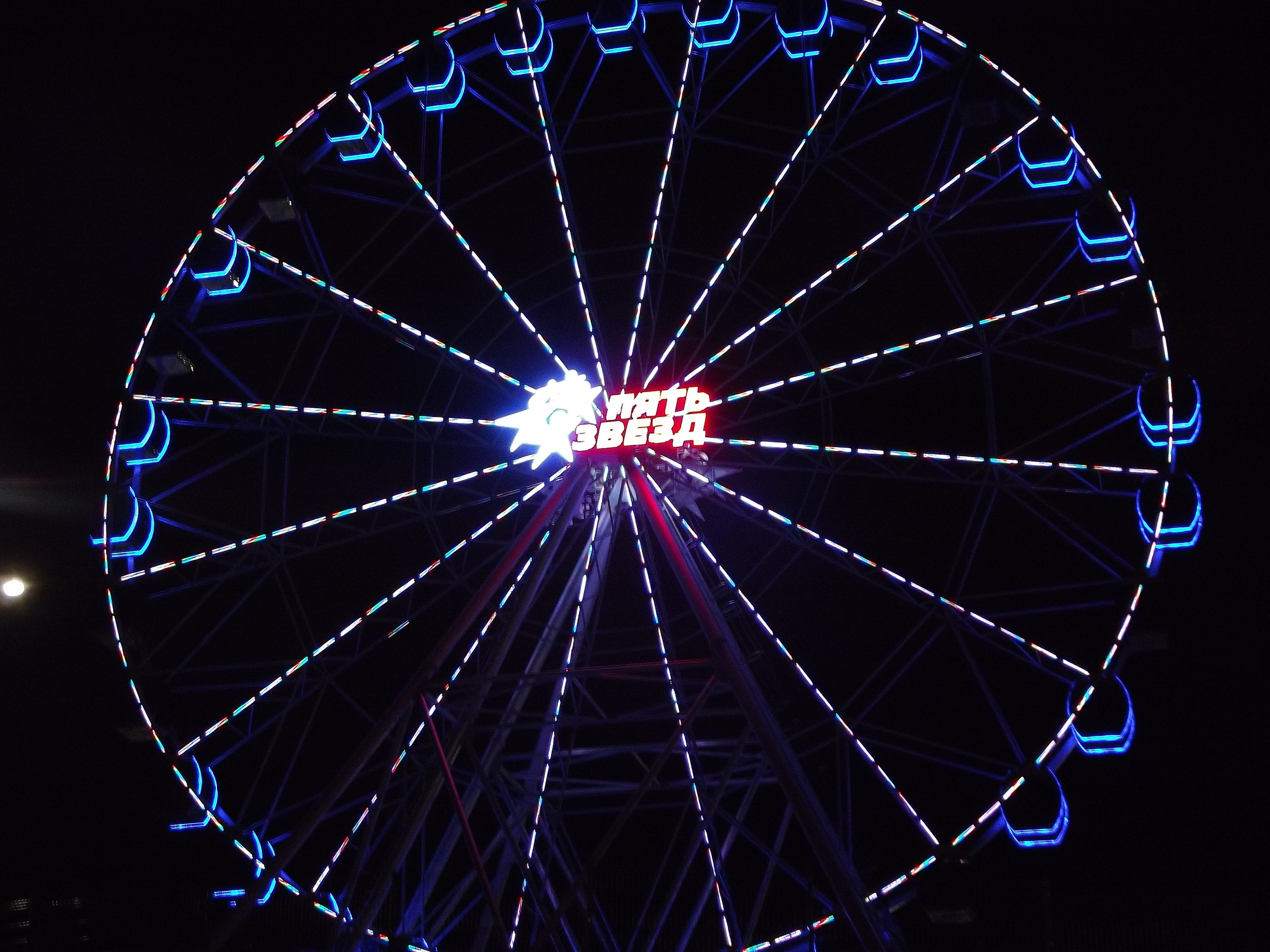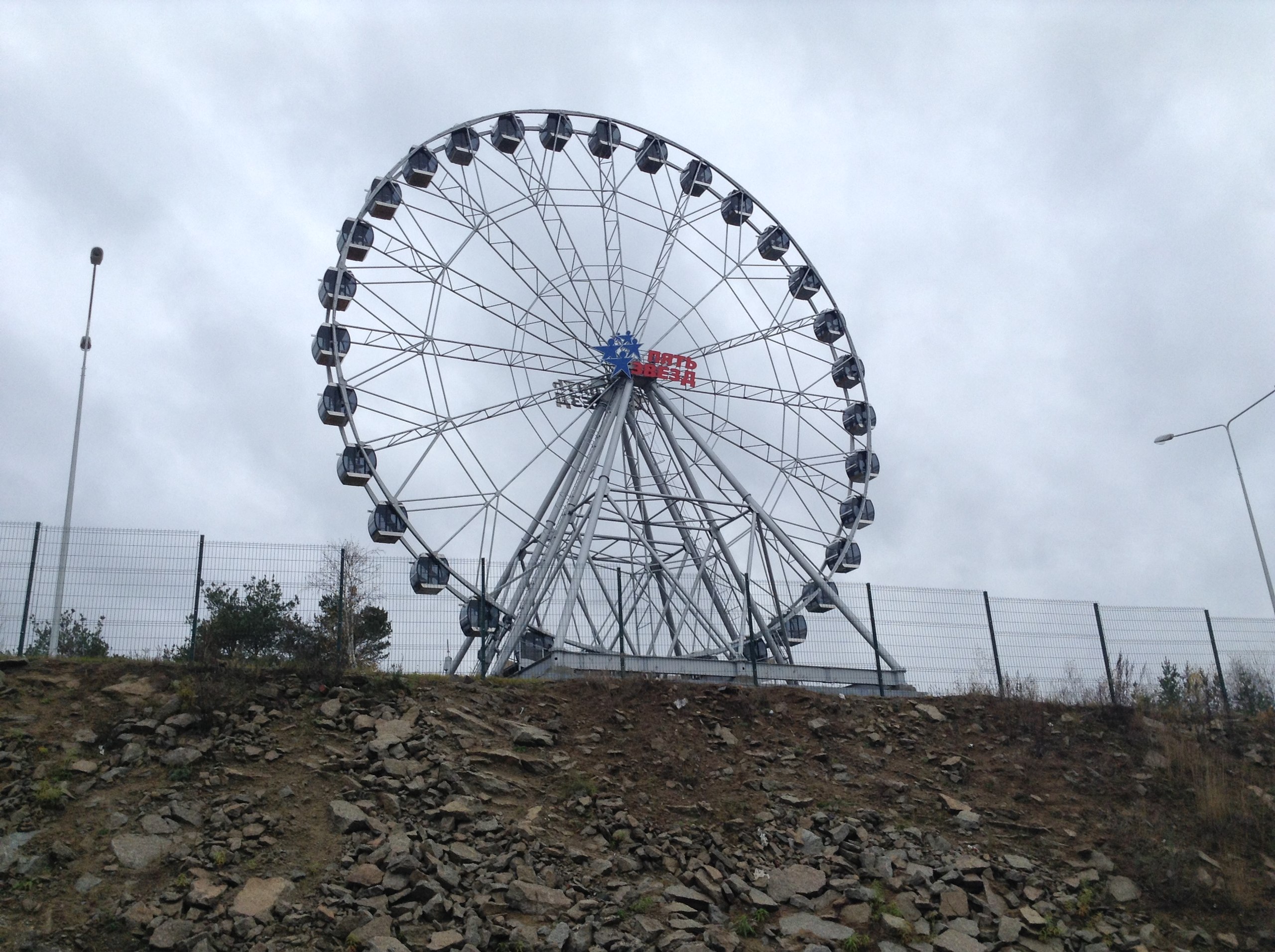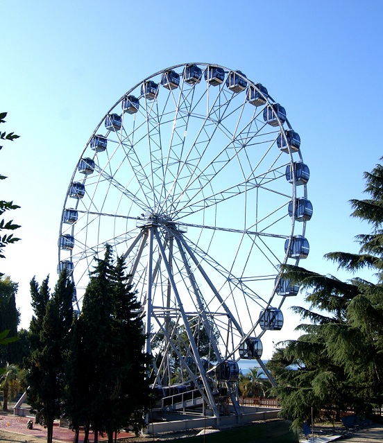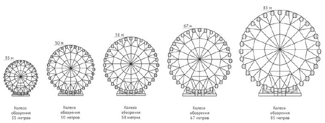 Колесо обозрения, предлагаемое к рассмотрению, конструктивно представляет собой каркас из массивных опор, поддерживающих ось металлического обода со спицами, на котором подвешиваются пассажирские остекленные кабинки с сидениями, столиком, оснащенные климат-контролем. Посмотрите фото нашего завода.